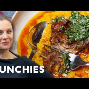 Karen Akunowiscz, chef/owner of Boston's Fox & the Knife and Bar Volpe, makes her version of osso buco, a classic braised Italian meal. Karen uses lamb shank for her osso buco and includes increased harissa in her braise for an unique flavor, and makes an abundant saffron risotto and an intense herb gremolata spiked with ginger. Check out the recipe here: Register for Munchies here: All Munchies videos release a complete week early on our site: Hungry?…